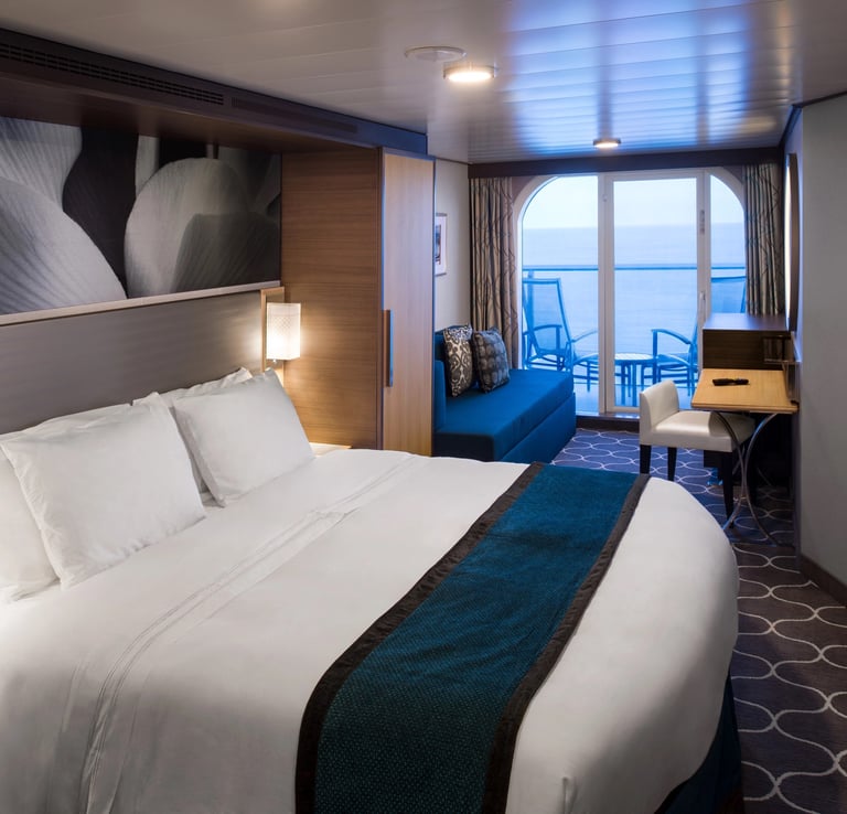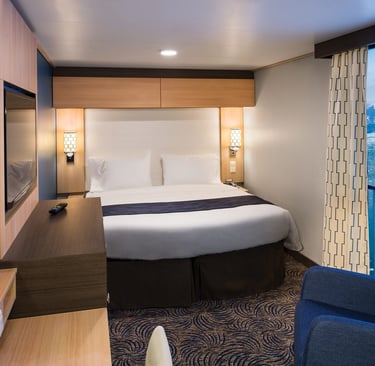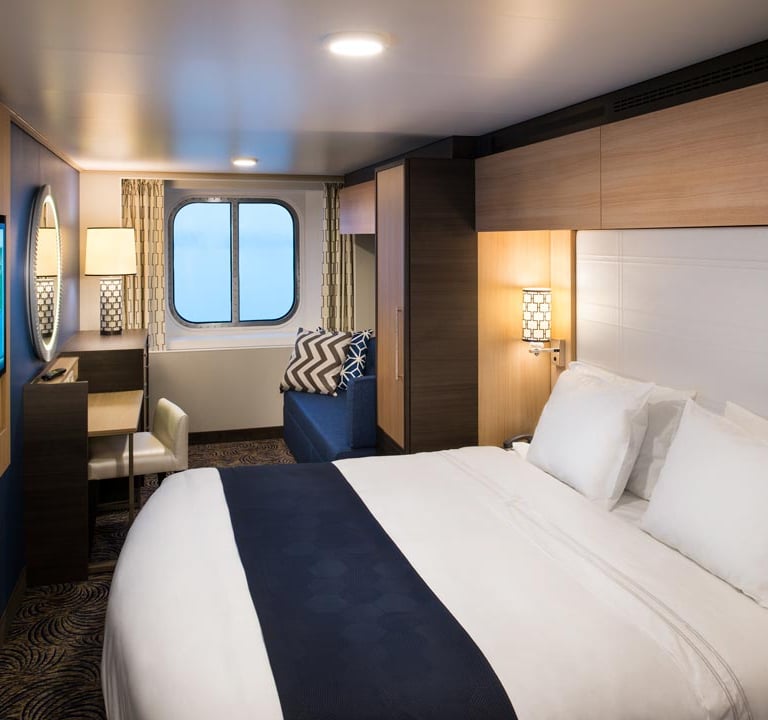 This room located lower on the ship decks have a porthole window to allow natural light. This allows for a more spacious feel. It is equipped with either two twin beds or a queen, sofa, plenty of storage, TV and a bathroom.